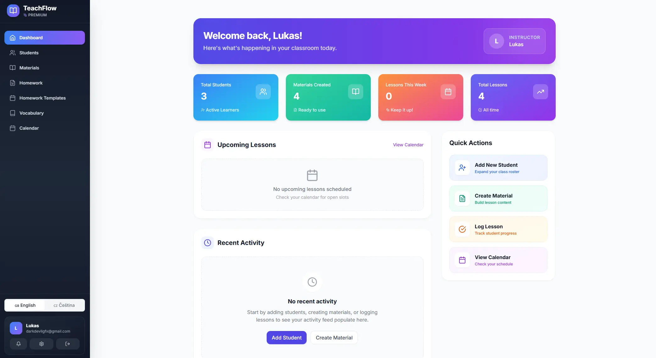 Multi-tenant SaaS platform for freelance English teachers. Comprehensive student management, lesson planning, homework tracking, and interactive student portal.