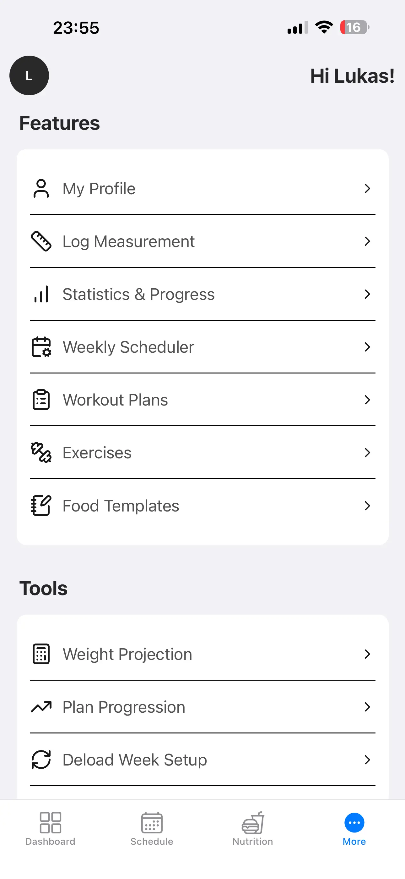 Cross-platform React Native fitness app with workout logging, nutrition tracking, progressive overload calculators, and drag-and-drop plan builder.